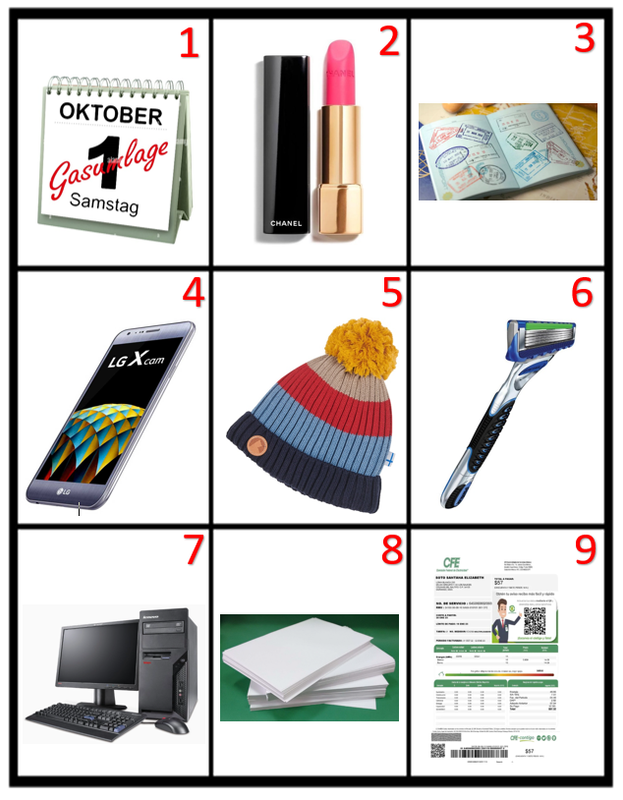 das Buch      das Handy      das Papier      der Computer      der Kalender      der Kamm      der Kaugummi      der Klebestift      der Lippenstift      der Personalausweis      der Radiergummi      der Rasierer      der Reisepass      der Ring      der Textmarker      die Agenda      die Mütze      die Rechnung