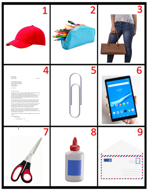 das Feuerzeug      das Klebeband      das Mäppchen      das Tablet      der Bleistift      der Brief      der Briefumschlag      der Kleber      der Laptop      die Creme      die Haarbürste      die Handtasche      die Kappe      die Klammer      die Kopfhörer      die Regenschirm      die schere      die Trinkflasche