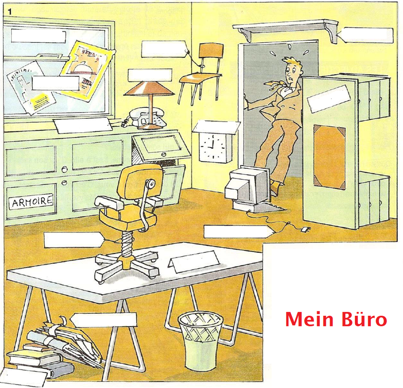 Ich gehe in mein Büro und was sehe ich? Das befindet sich über der Tür, vor dem Fenster hängen und an der steht ein Stuhl. Auf der rechten Seite steht ein unter dem Fenster. Meine ist unter dem Stuhl, mein steht links an der Wand. Die und liegen auf dem Boden, mein steht auf dem Tisch, das steht hinter der Lampe und mein steht vor der Tür.