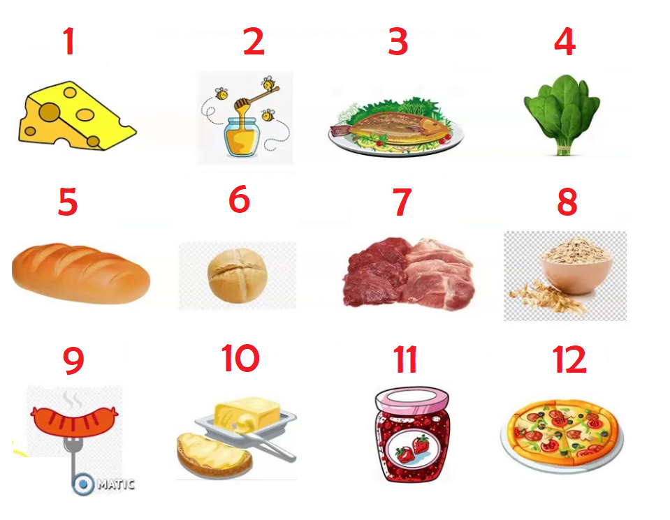 das Brötchen      das Brot      das Fleisch      das Müsli      der Fisch      der Honig      der Käse      der Spinat      die Butter      die Marmelade      die Pizza      die Wurst