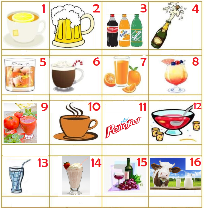 das Bier      das Mineralwasser      das Wasser mit Eis      der Champagner      der Fruchtcocktail      der heiße Kakao      der Kaffee      der Milchshake      der Orangensaft      der Punsch      der Tee      der Tomatensaft      der Wein      der Whisky      die Milch      die Sodas
